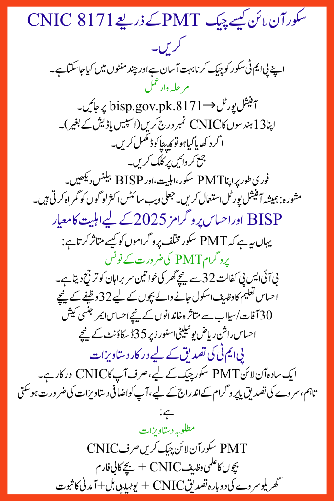 The 8171 PMT Score Check by CNIC is the calmest way for Pakistani relations to confirm their aptness for BISP Kafalat payments and Ehsaas benefits. With just your CNIC, you can opinion your poverty score, balance, and Taleemi Wazaif status in notes.