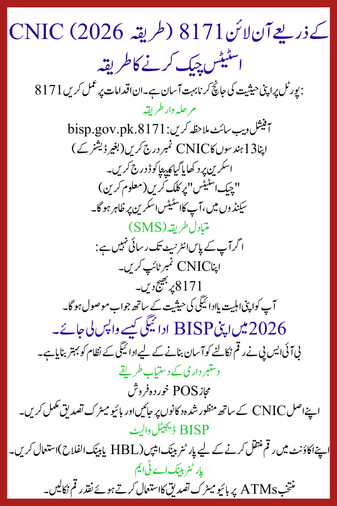 The 8171 Web Portal is the official and most trusted online platform for checking details related to the Benazir Income Support Programme (BISP) in Pakistan. Millions of families use this portal to check their eligibility, payment status, PMT score, and Taleemi Wazaif details. In 2026, the Government of Pakistan has further upgraded the portal to make it faster, safer, and more user-friendly. This guide explains everything in simple language so that anyone in Pakistan can understand and use the 8171 portal without confusion.