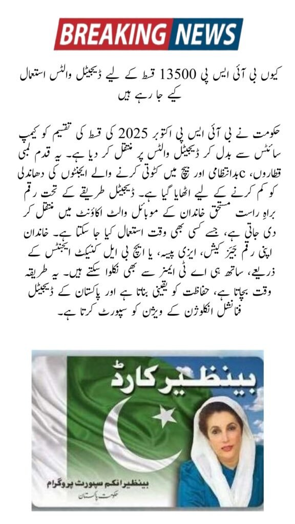 The Government of Pakistan has approved the BISP 13500 Installment October 2025 for poor families across the country. This installment is part of the Benazir Income Support Programme (BISP) and aims to provide relief against rising inflation. Earlier, people had to visit crowded campsites to collect their payments, but now the system has changed. The government has shifted to digital wallets like JazzCash, Easypaisa, and HBL Konnect to make the process safe, transparent, and quick. This update is especially helpful for women, elderly, and rural families.