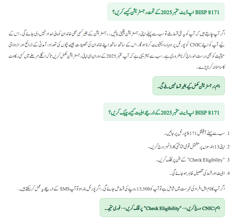 The BISP 8171 Update September 2025 is a major step by the government of Pakistan to provide timely support to deserving families. Through this update, millions will receive Rs 13,500 transparently and efficiently. With both the portal and SMS options, checking eligibility has become easier than ever. If you haven’t registered yet, do it now, update your CNIC, and keep your documents ready. This installment is not just financial help—it’s a lifeline for families struggling with rising costs of living.