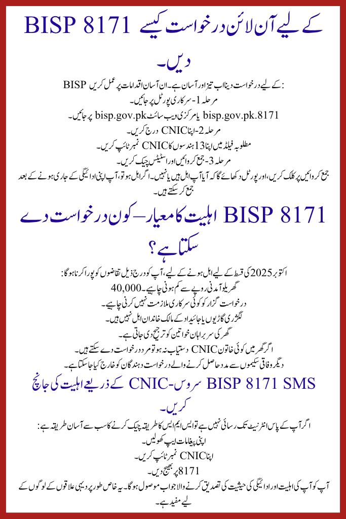 | Benazir Income Support Programme (BISP 8171) | October 2025 | December 2025 | Rs. 13,500 (per installment) | Online via 8171 Portal / SMS |
