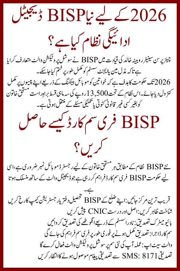 The Benazir Income Support Programme (BISP) has officially transitioned to a fully digital payment ecosystem in 2026. This initiative ensures that all eligible women receive their financial assistance directly through secure digital wallets and BISP Free SIM Card issued at official centers.