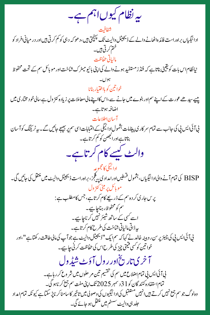 BISP Social Protection WalletPhase 1 started mid-November 2025Last date to collect SIM: 31 December 2025Regular BISP cash assistance as per eligibilityOffline: Visit BISP office or camp with CNIC