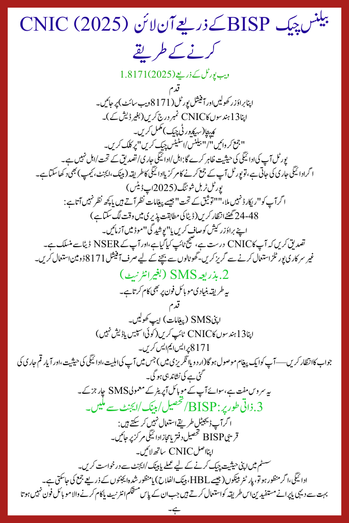 | BISP Balance & Payment Check 2025 | Fully active 2025 cycle | Rs. 13,500 per eligible quarter | Online via 8171 portal, SMS to 8171, or in-person at BISP/Tehsil office / partner banks |