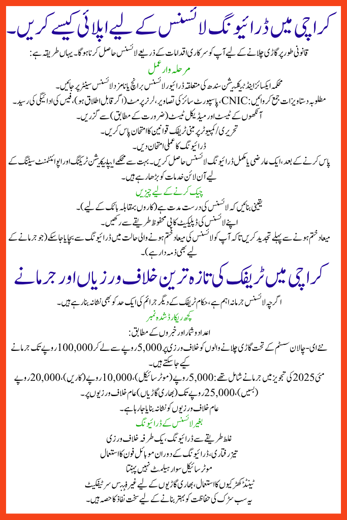 In short: If you are driving in Karachi, having a valid driving licence is firm. The fine for driving deprived of a licence has been raised significantly (Rs 25,000 for bikes, Rs 50,000 for cars) in Sindh’s efficient rules. Enforcement via e-challan and digital monitoring means you cannot shoulder mercy. Play it safe: get your licence the right way, obey traffic rubrics, carry your licence while heavy, and wage any fines punctually. This way, you avoid heavy penalties and contribute to safer roads for everyone in the city.