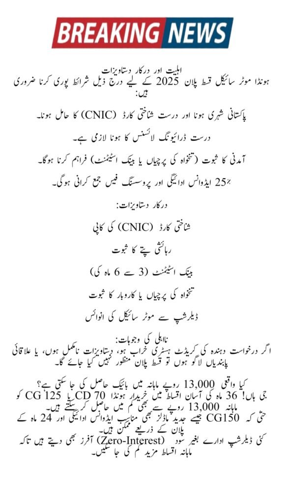 The Honda Motorcycle Installment Plan 2025 allows Pakistani buyers to own popular Honda bikes with flexible EMIs starting as low as Rs. 13,000 per month. This program covers select models like CD 70, CG 125, and CG150, offering short-term zero-markup plans and longer-term affordable financing. It’s designed to make bike ownership accessible for students, professionals, and delivery riders.