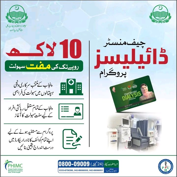 The CM Punjab Dialysis Card 2025 is a special health card that gives patients access to free dialysis treatment at government-approved hospitals. It is part of the Punjab Health Welfare Program, designed to support patients suffering from kidney failure. Each eligible patient receives a personalized dialysis card that can be used for free treatment at registered hospitals. Through this card, the Punjab Government also provides access to nephrologists, medication support, and follow-up care.