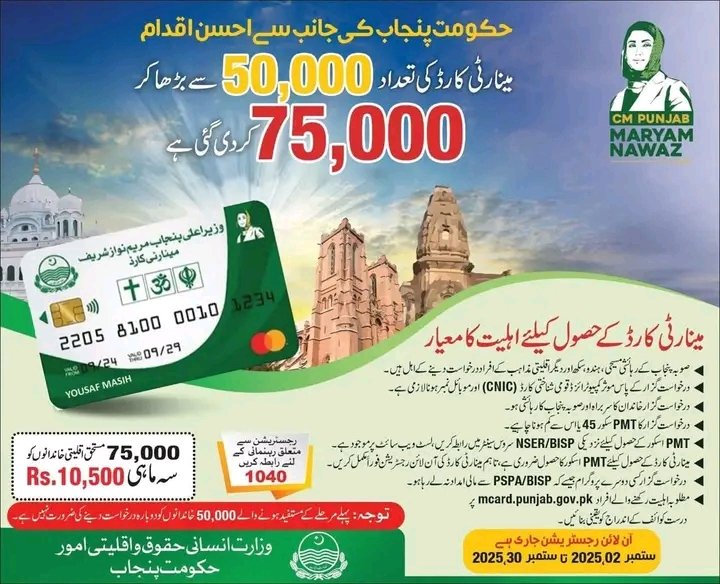 The Punjab Minority Support Card 2025 is a key welfare project designed to support low-income Christian, Hindu, Sikh, and other minority families. This Minority Support Card Punjab provides monthly financial help, education support, and medical assistance to reduce poverty. The government aims to strengthen social equality and improve the living standards of communities through the Punjab Minority Support Card.
