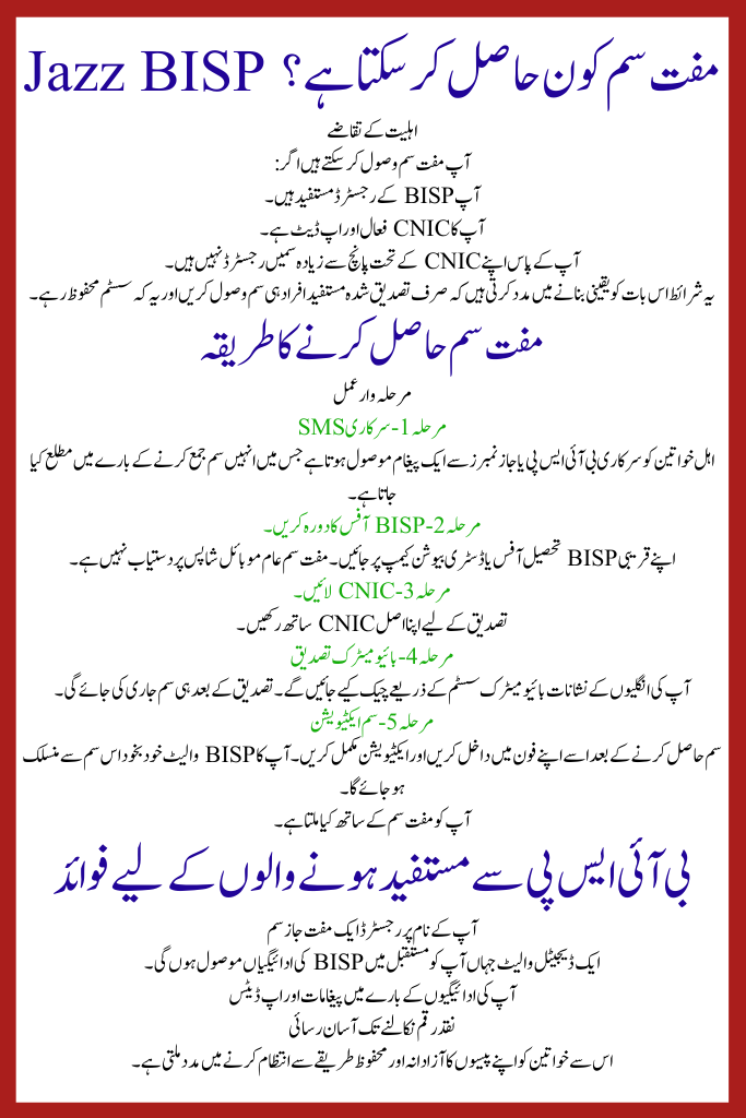 The Jazz BISP Free SIM Program is part of the administration’s plan to shift BISP expenditures to a digital and secure system. With the free SIM, beneficiaries will receive their future BISP payments straight in a mobile wallet in its place of waiting in long queues or commerce with cash delivery glitches.