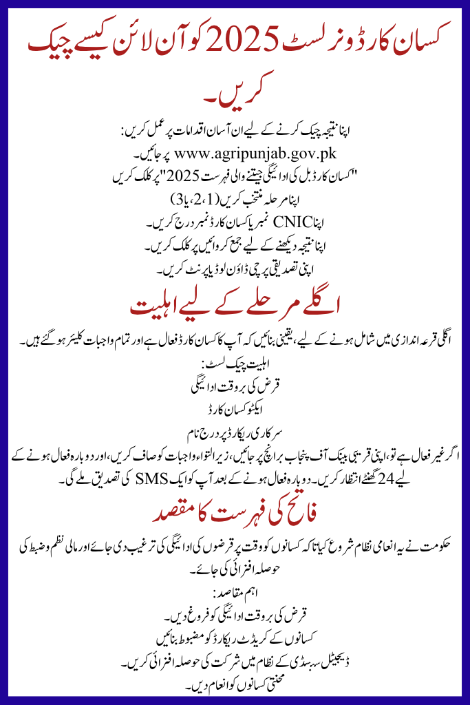 The Kisan Card Winner List 2025 reproduces the Punjab Administration’s exertion to empower farmers and reward responsibility. By paying dues on time and custody your card active, you secure both rewards and your financial future.
