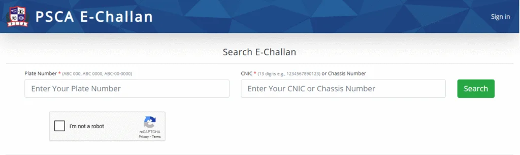 Visit the PSCA e-challan portal and enter your vehicle number and CNIC.