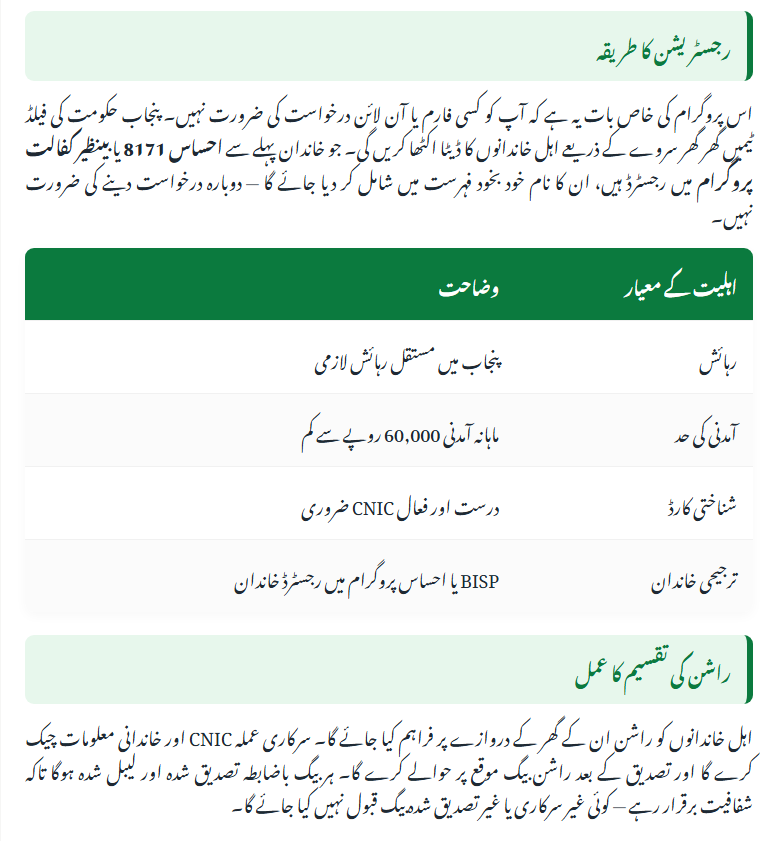 Eligible families will receive free rashan at their doorstep. Government staff will verify CNIC numbers and family information before handing over the food package.