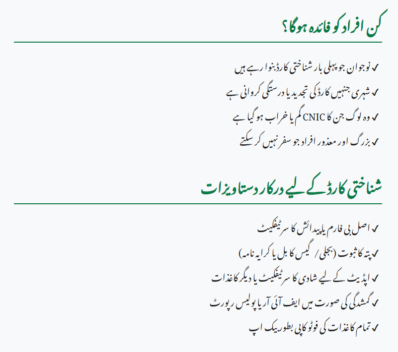 | Services Offered | New CNIC, renewals, updates, duplicates |