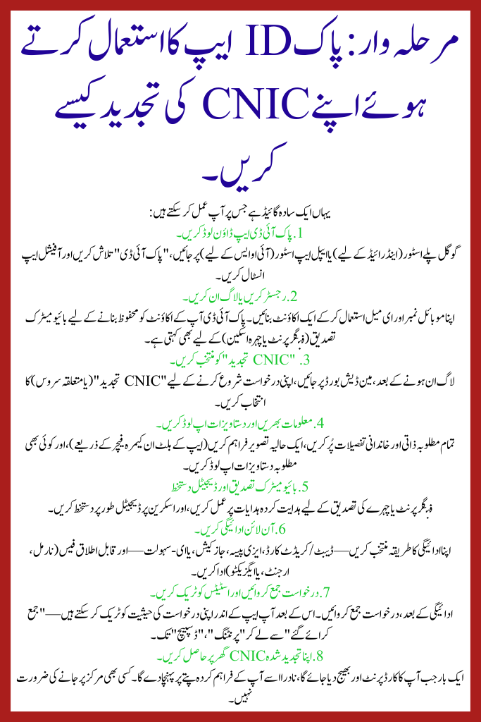- For overseas Pakistanis, this means you can renew CNIC or apply for other identity cards without relying on agents or traveling back to Pakistan.