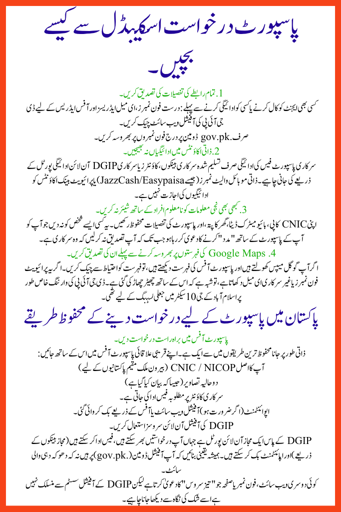 Keep your CNIC copy, biometric data, home address, and passport details safe. Do not give this to anyone calling you claiming to “help” with your passport unless you have verified they are official.
