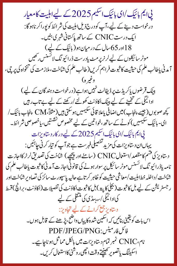 The PM Bike Scheme 2025 (often mentioned to as the PM Electric Bike / E-Bike Scheme) is a milestone inventiveness by the Government of Pakistan to make reasonable and eco-friendly two-wheeler transport accessible to scholars, youth, and working individuals. With rising petrol prices and limited transportation in many cities, this scheme aims to give mobility, lower traveling costs, and endorse green conveyance.