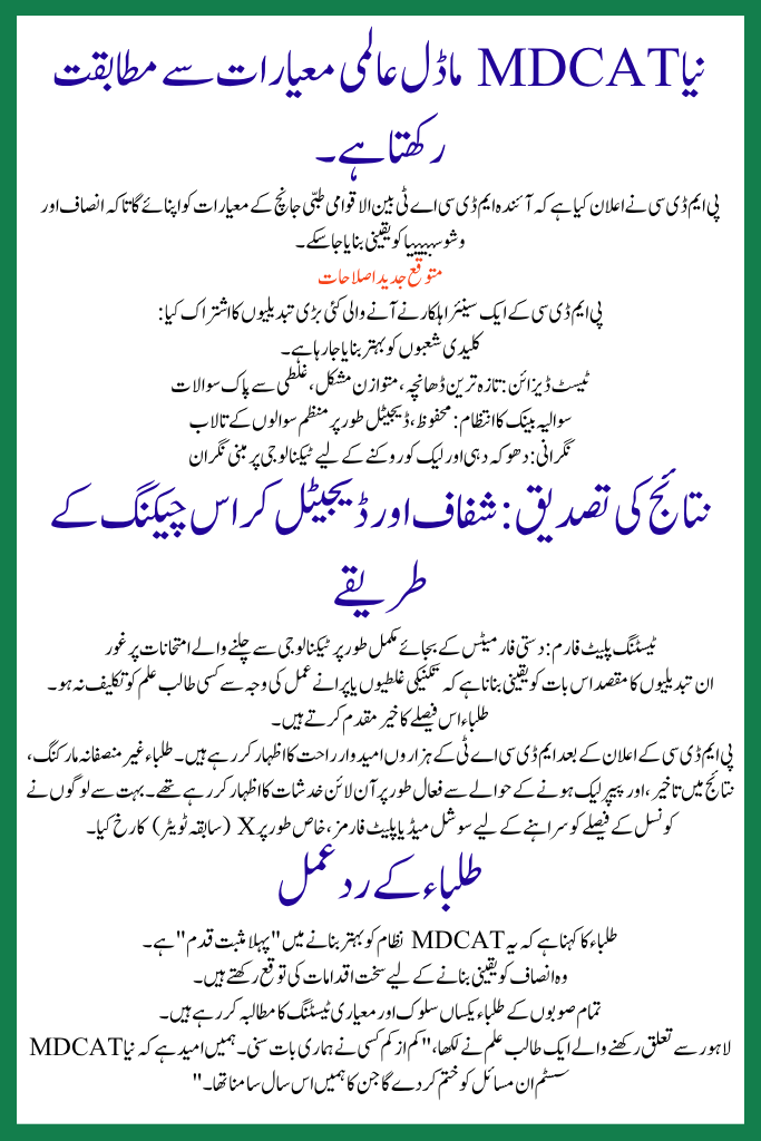 PMDC has announced that the upcoming MDCAT will adopt international medical testing standards to ensure fairness and reliability.