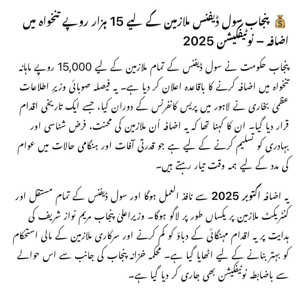 The Punjab government has officially announced a Rs. 15,000 salary increase for Civil Defense employees, bringing long-awaited relief for thousands of workers across the province. The decision was confirmed during a press conference in Lahore by Punjab Information Minister Uzma Bukhari, calling it a historic move to recognize the dedication of employees who serve during emergencies and disasters.