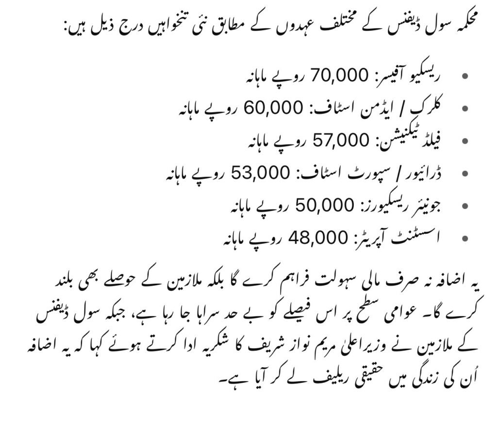 The salary hike will immediately apply to all Civil Defense employees across Punjab, including both permanent and contract-based workers. The increase reflects Chief Minister Maryam Nawaz Sharif’s focus on improving financial stability for public sector workers amid high inflation.