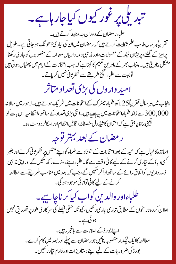 The Punjab Planning Big Change in Matric Exam Schedule is seriously seeing this change, keeping in mind the ease and needs of millions of students. If exams are held after Ramadan, it can help students prepare better and reduce unnecessary stress. Once the final decision is made, boards across Punjab will issue updated agendas.