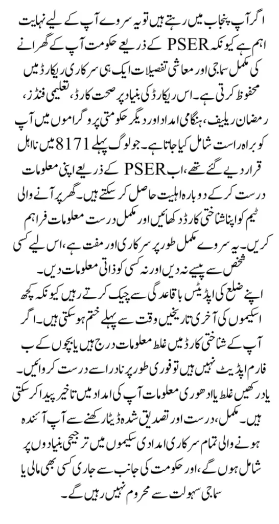 Completing the PSER Survey 2025 gives families priority access to Punjab welfare programs. Once verified, your information will automatically qualify you for future benefits without repeated paperwork.