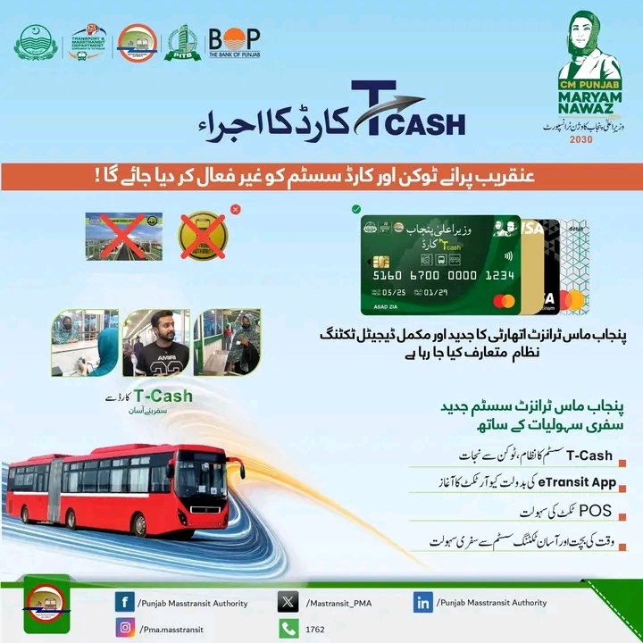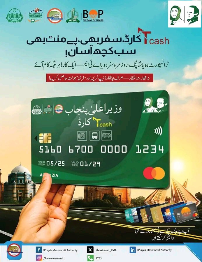 The T-Cash Card is a reloadable smart card introduced by the Punjab Mass Transit Authority (PMTA). It allows passengers to pay fares for Lahore Metro Bus, Multan Metro, and Orange Line Train without using cash.
