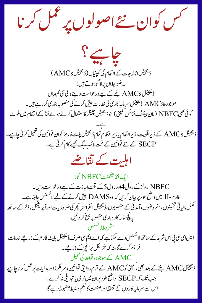 | Assistance / Scope | Rules for licensing, operating, and regulating Digital AMCs and DAMS in Pakistan |