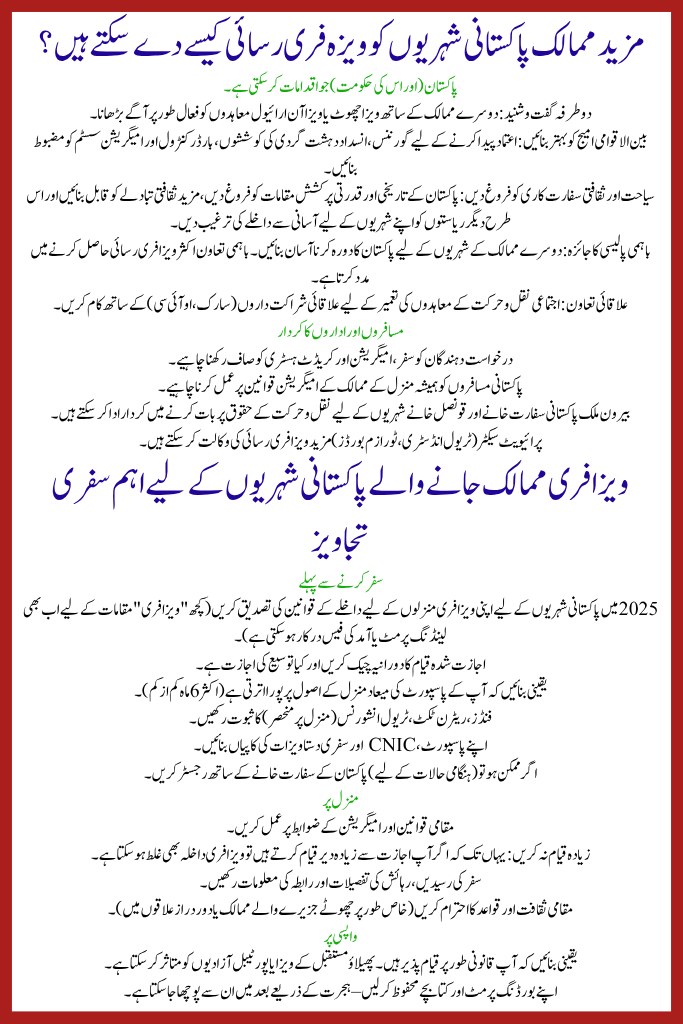 - Reciprocal policy review: Make it easier for nationals of other countries to visit Pakistan; reciprocity often helps in gaining visa-free access.