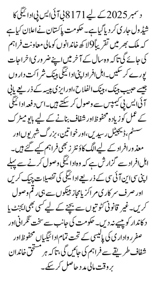 The 8171 BISP Payment Schedule December 2025 has been officially announced for eligible households across Pakistan. This installment provides crucial financial support for low-income families, helping them meet basic needs before the end of the year. With millions of families expected to benefit nationwide, the government has organized a province-wise phased payment system to ensure a smooth and transparent distribution process.